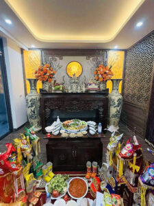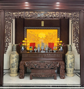 Bộ Đồ Thờ Vẽ Vàng 24K Bát Hương Rồng Đắp Nổi Kết Hợp Đỉnh Hạc Tứ Linh Tinh Xảo Ban 175cm – 217cm