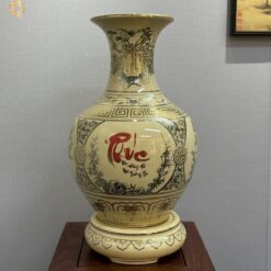 Đây là chiếc bình gốm có hình dáng thanh thoát, đẹp mắt. Trên thân bình được trang trí bằng kỹ thuật vẽ men vàng 24K với hình ảnh chữ Lộc hay Phúc và cảnh hoa mai đối xứng nhau tượng trưng cho sinh sôi, phát triển và tài lộc đủ đầy.