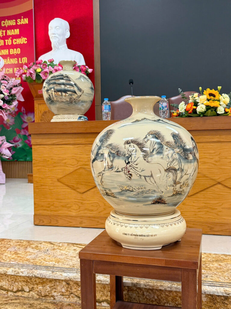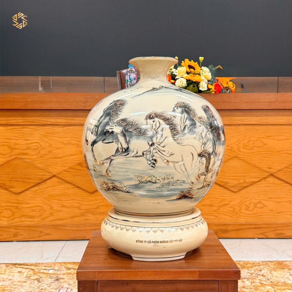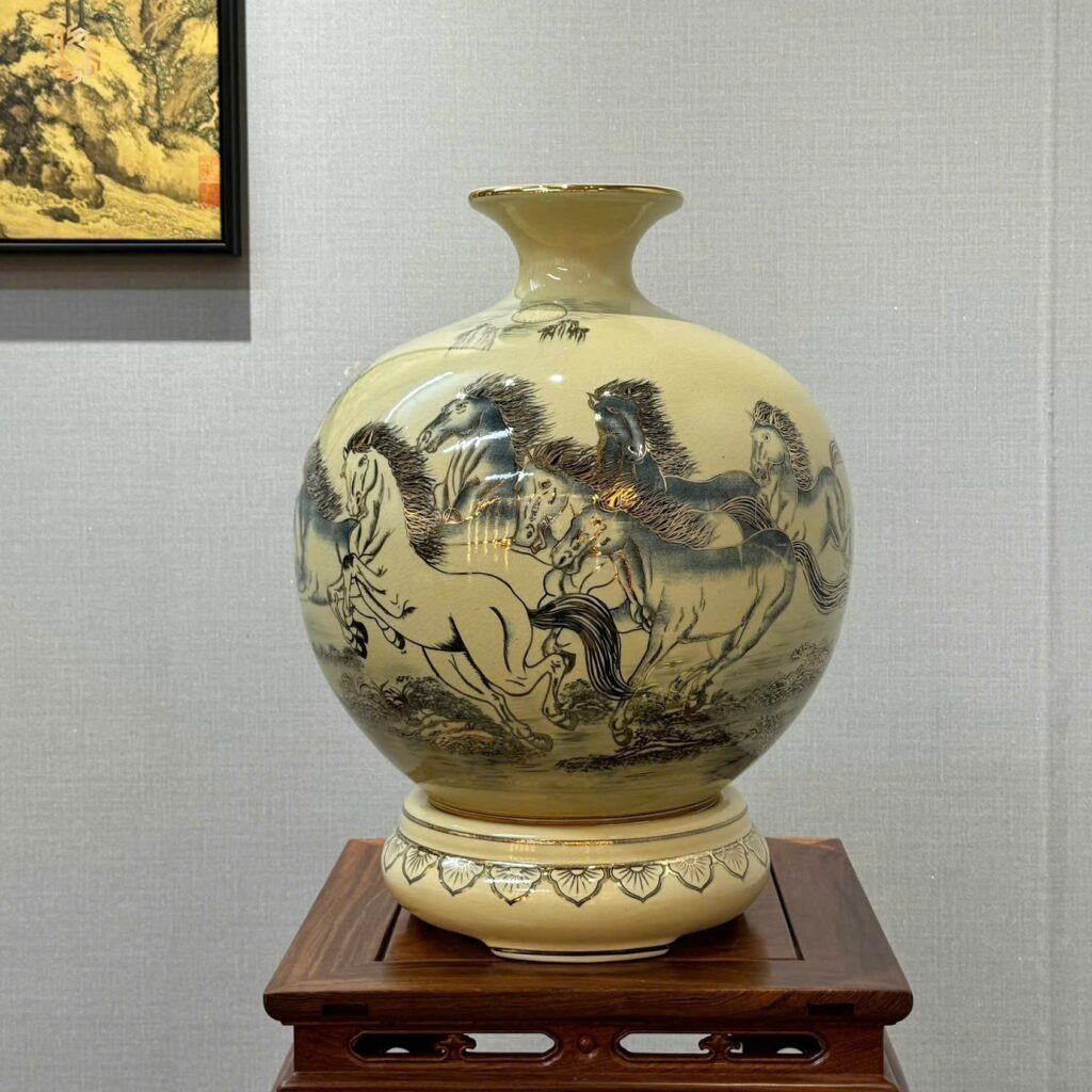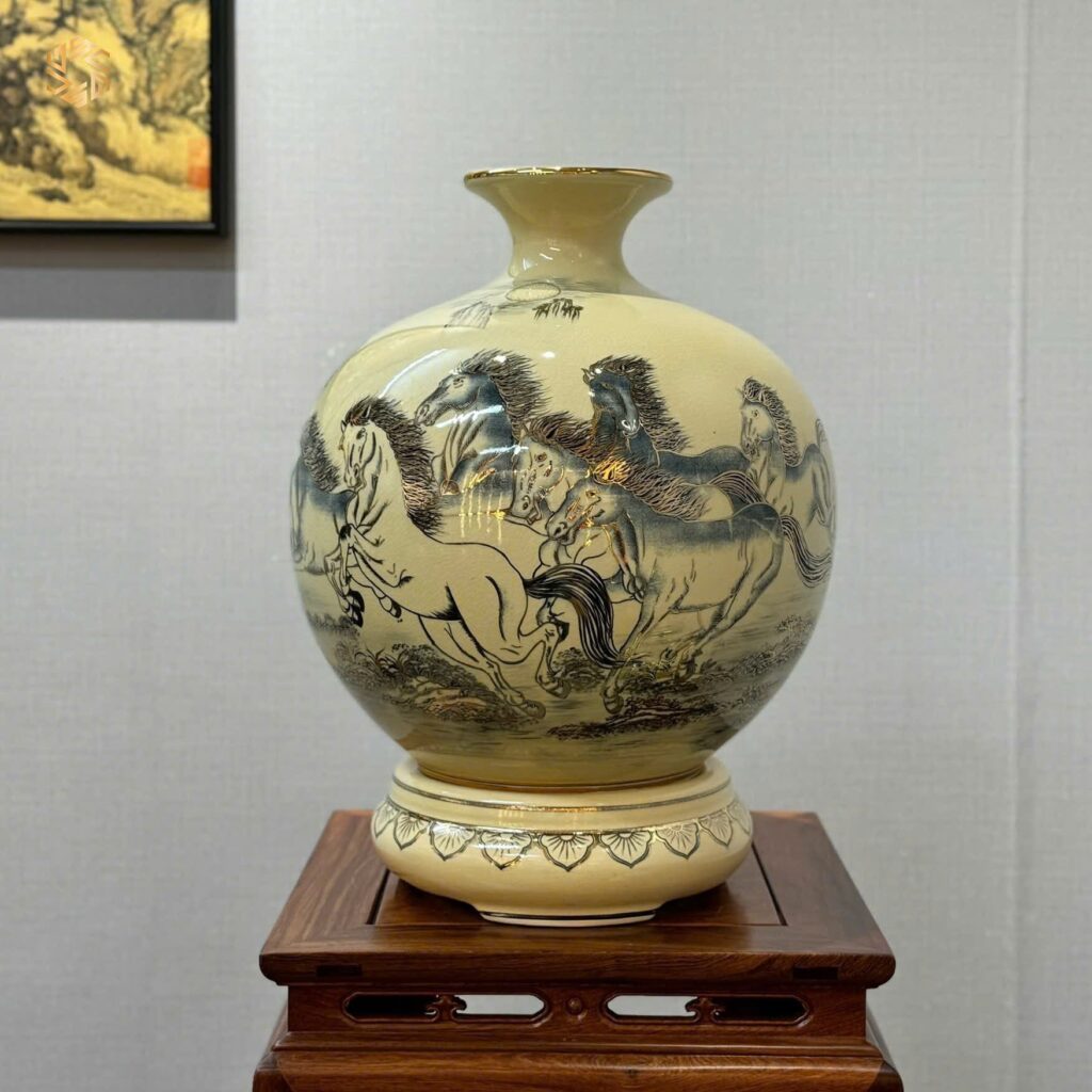 Bình Hút Lộc Gốm Chu Đậu H45 Hoạ Tiết Mã Đáo Thành Công Vẽ Vàng 24K HLMD06
