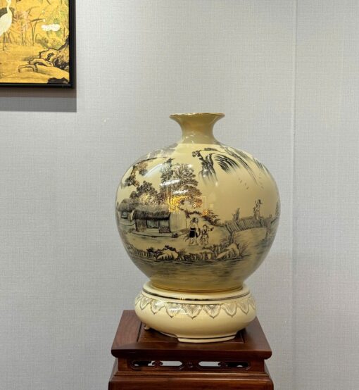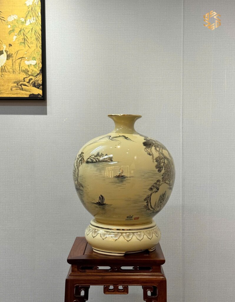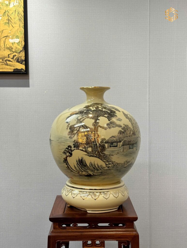 Bình hút lộc H45 gốm chu đậu hoạ tiết Sơn Thuỷ Hữu Tình ý nghĩa vẽ vàng 24k- Nghệ Nhân NN01