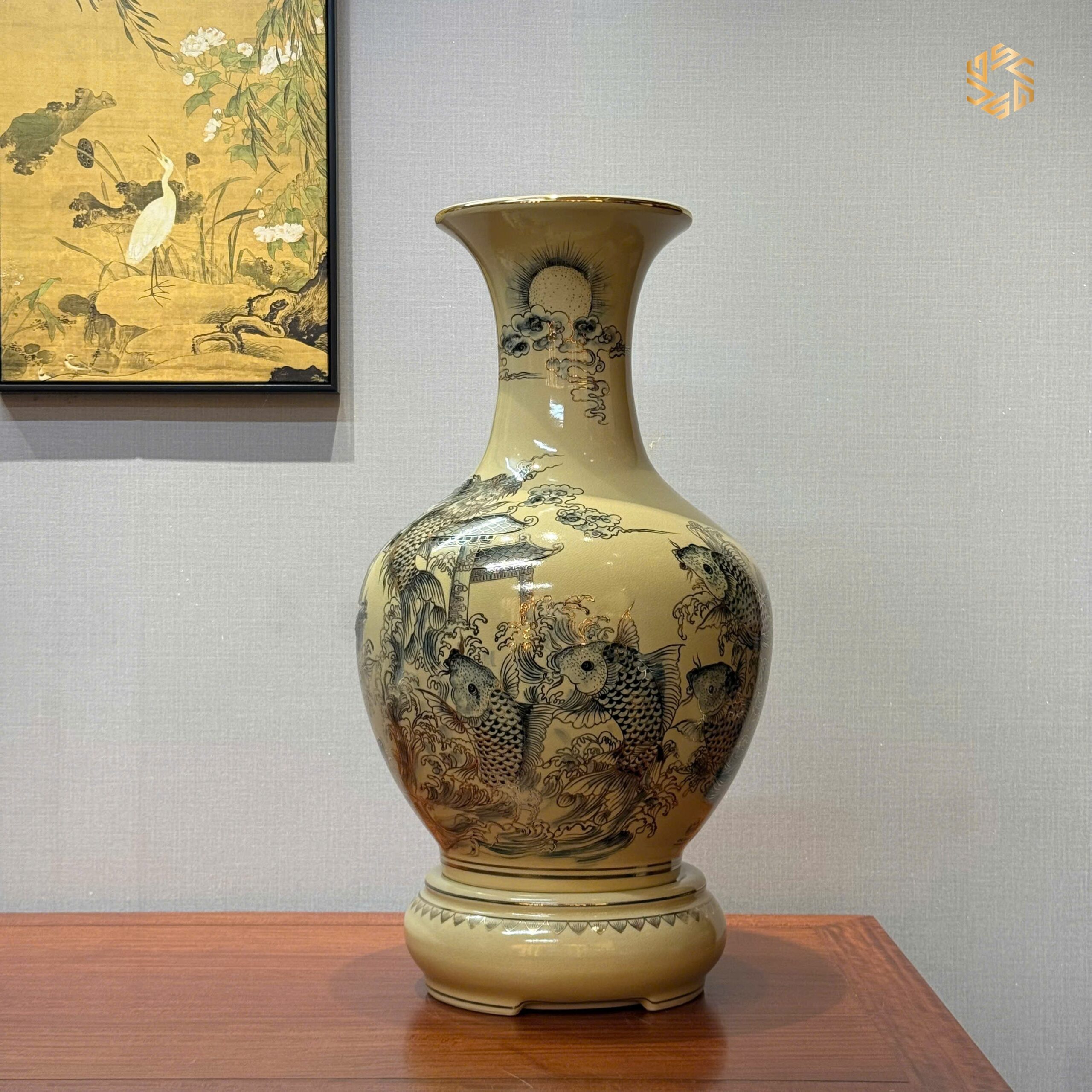 Bình Phú Quý Gốm Chu Đậu H65 Hoạ Tiết Cá Chép Vượt Vũ Môn Vẽ Vàng 24K