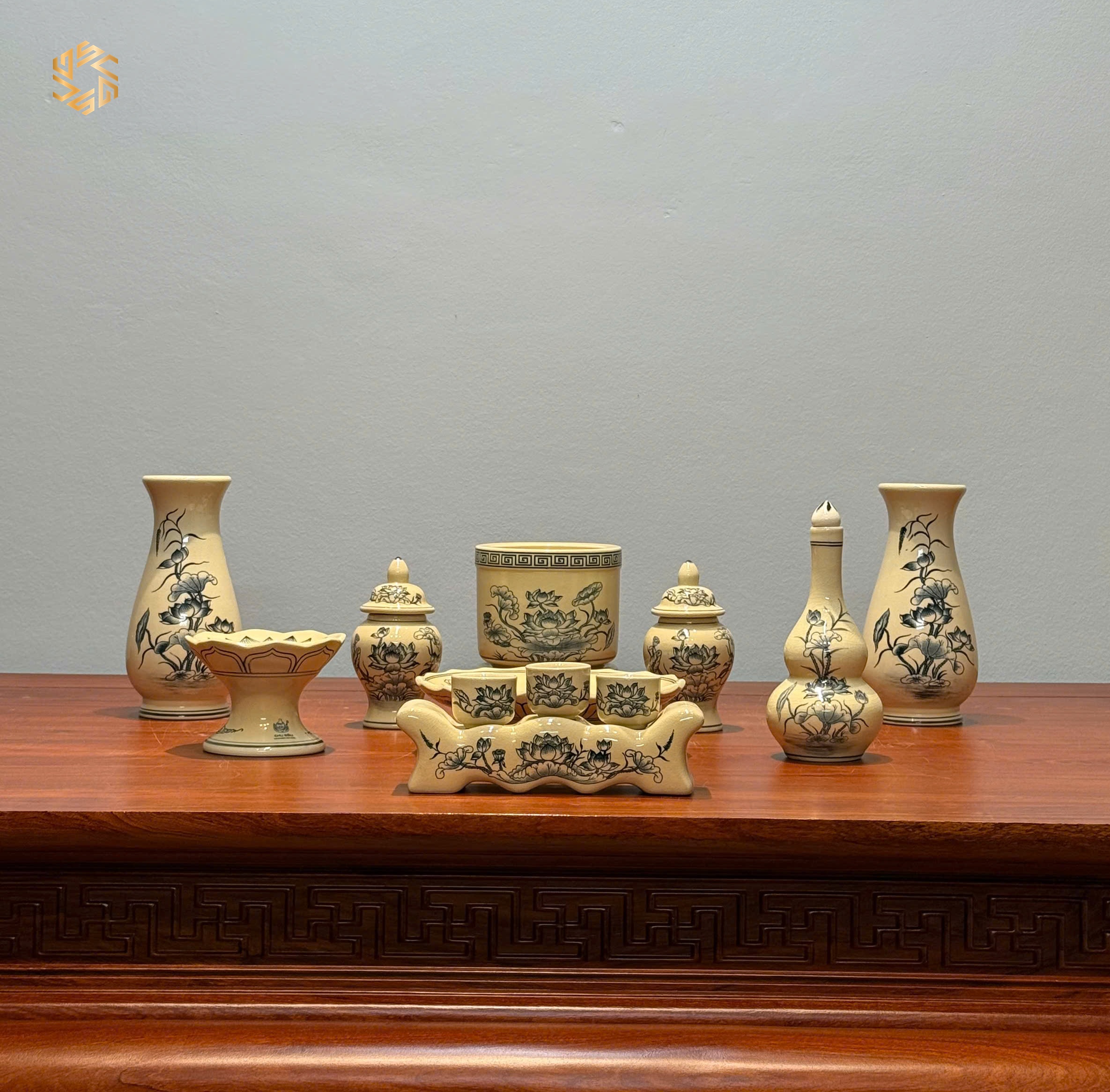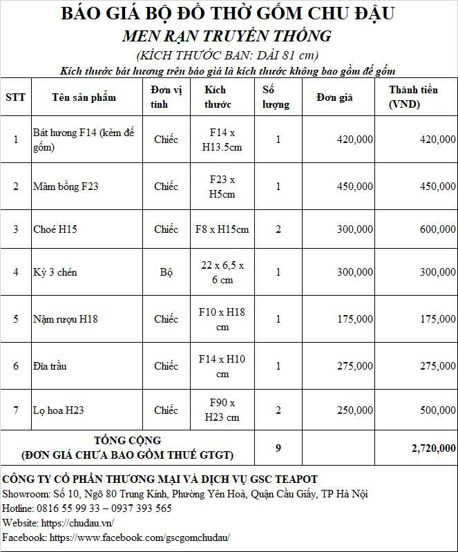 Bộ Đồ Thờ Gốm Chu Đậu Hoạ Tiết Hoa Sen Men Truyền Thống Ban Dài 81cm