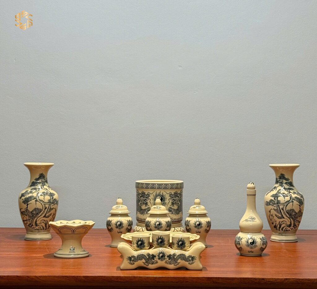 Bộ Đồ Thờ Gốm Chu Đậu Hoạ Tiết Rồng Men Truyền Thống Ban Dài 88cm – 95cm.