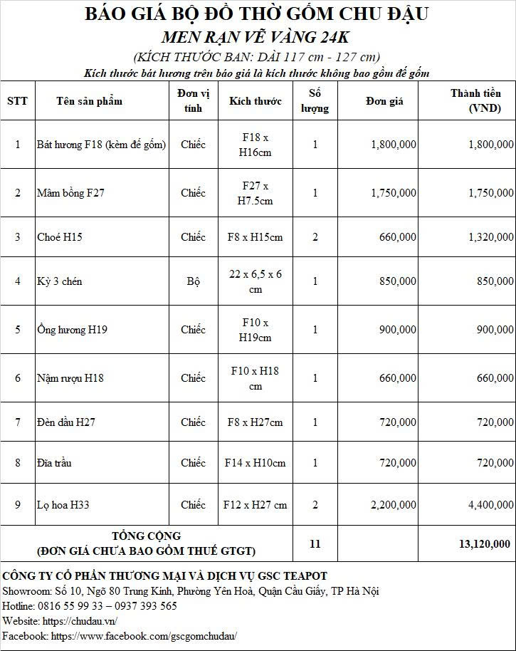 Bộ đồ thờ gốm chu đậu hoạ tiết vẽ vàng 24k Ban dài 95 cm – 117 cm