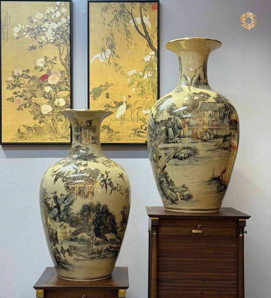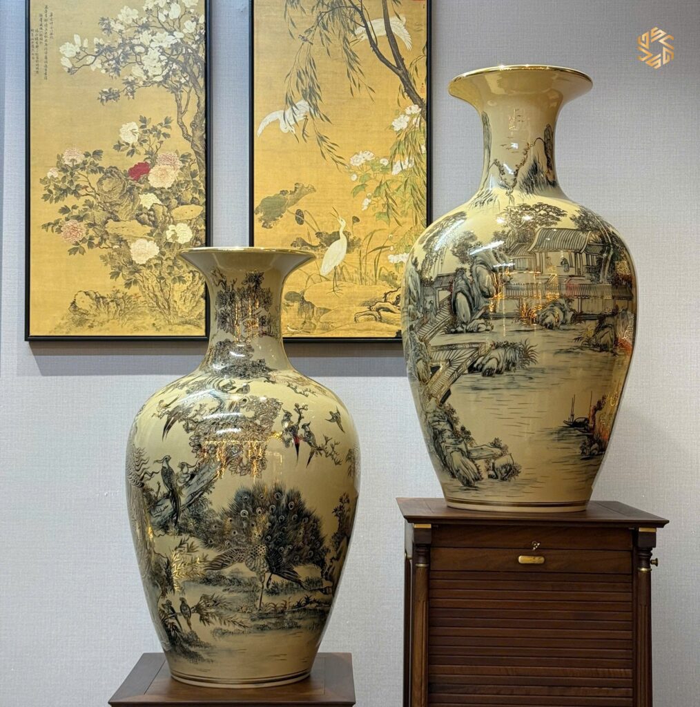 Cặp Bảo Bình Gốm Chu Đậu H95 Hoạ Tiết Sơn Thuỷ Hữu Tình Vẽ Vàng 24K Tinh Xảo Bậc Nhất.