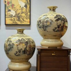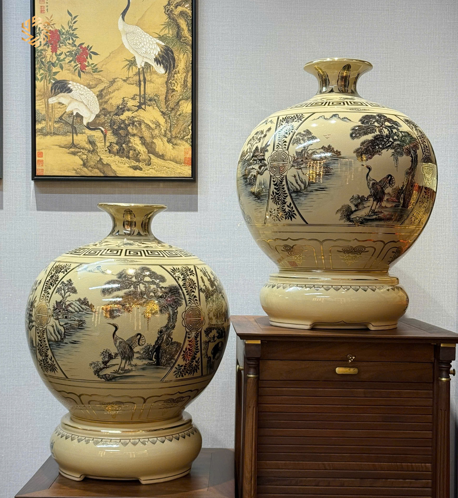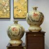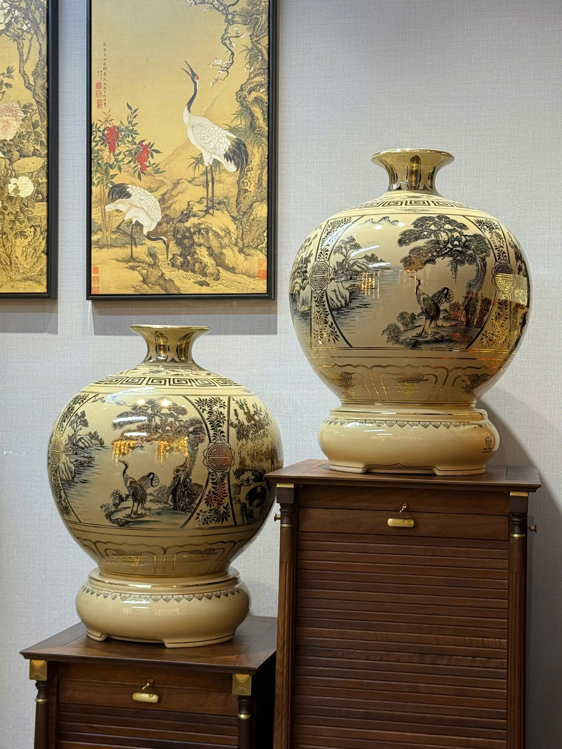 Cặp Bình Hút Lộc H45 Pro Gốm Chu Đậu Hoạ Tiết Tứ Cảnh Sơn Thuỷ Vẽ Vàng 24K