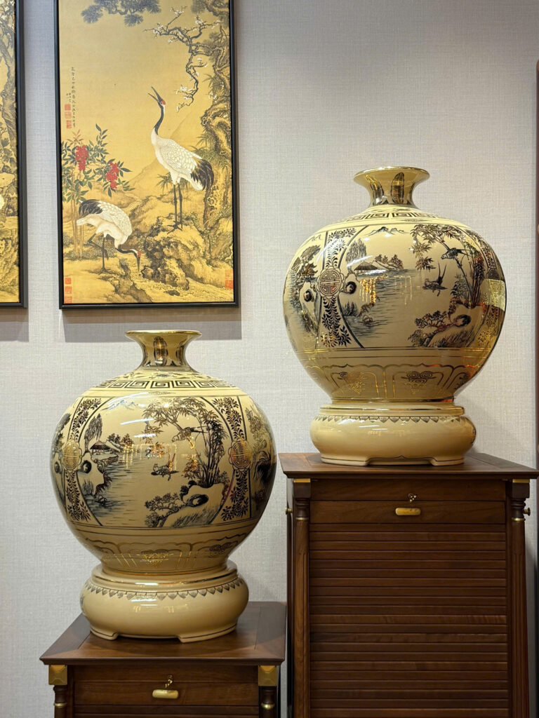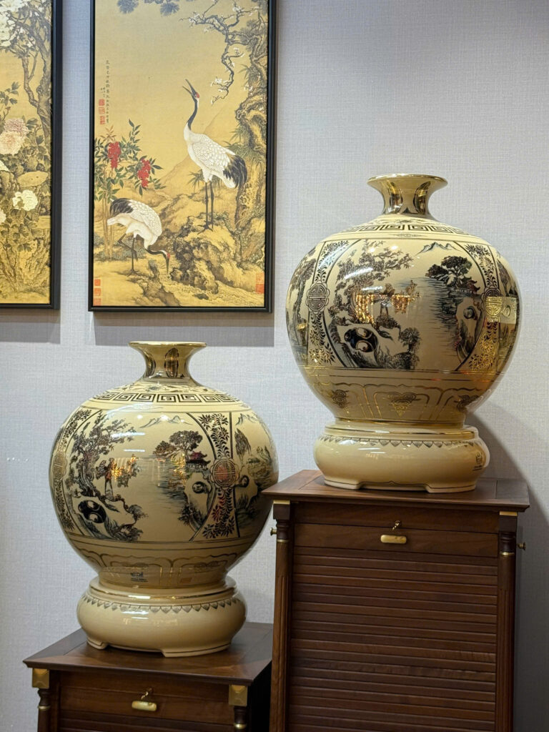 Cặp Bình Hút Lộc H45 Pro Gốm Chu Đậu Hoạ Tiết Tứ Cảnh Sơn Thuỷ Vẽ Vàng 24K