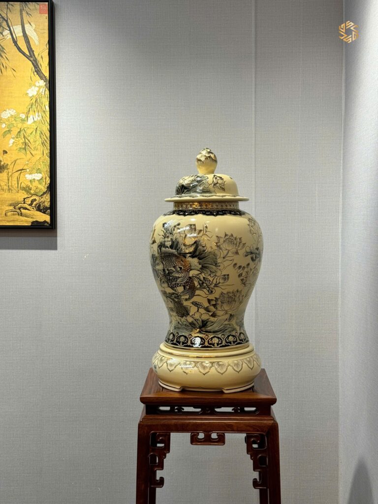 Choé Gốm Chu Đậu H60 Hoạ Tiết Hoa Sen Cá Chép Vẽ Vàng 24k Ý Nghĩa