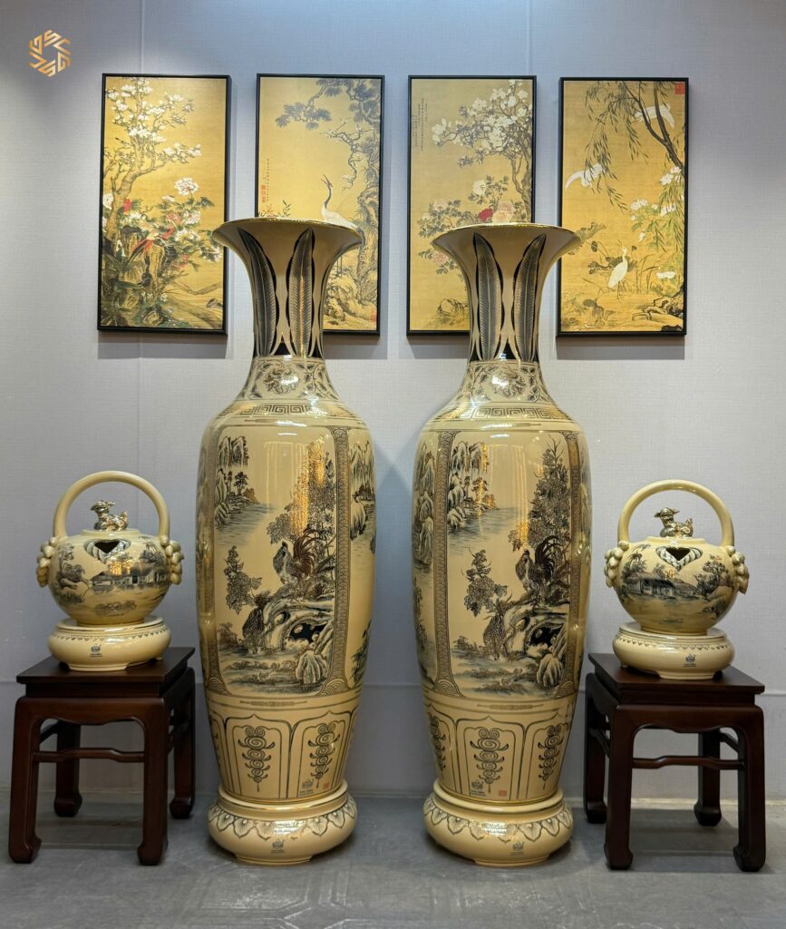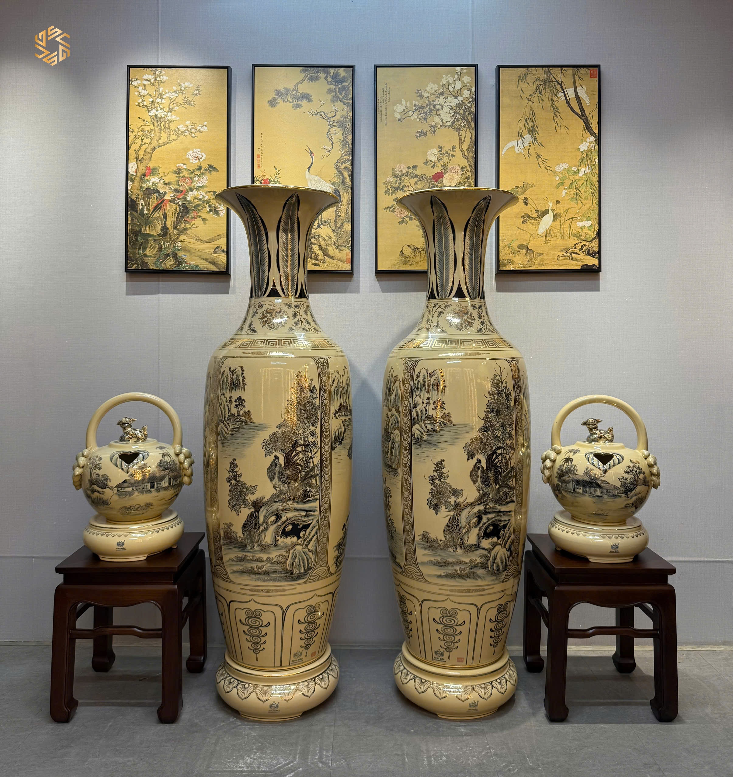 Combo Gốm Chu Đậu Lộc Bình 1M65 Tứ Cảnh Sơn Thuỷ & Bình Vôi Vẽ Vàng 24K Tinh Xảo