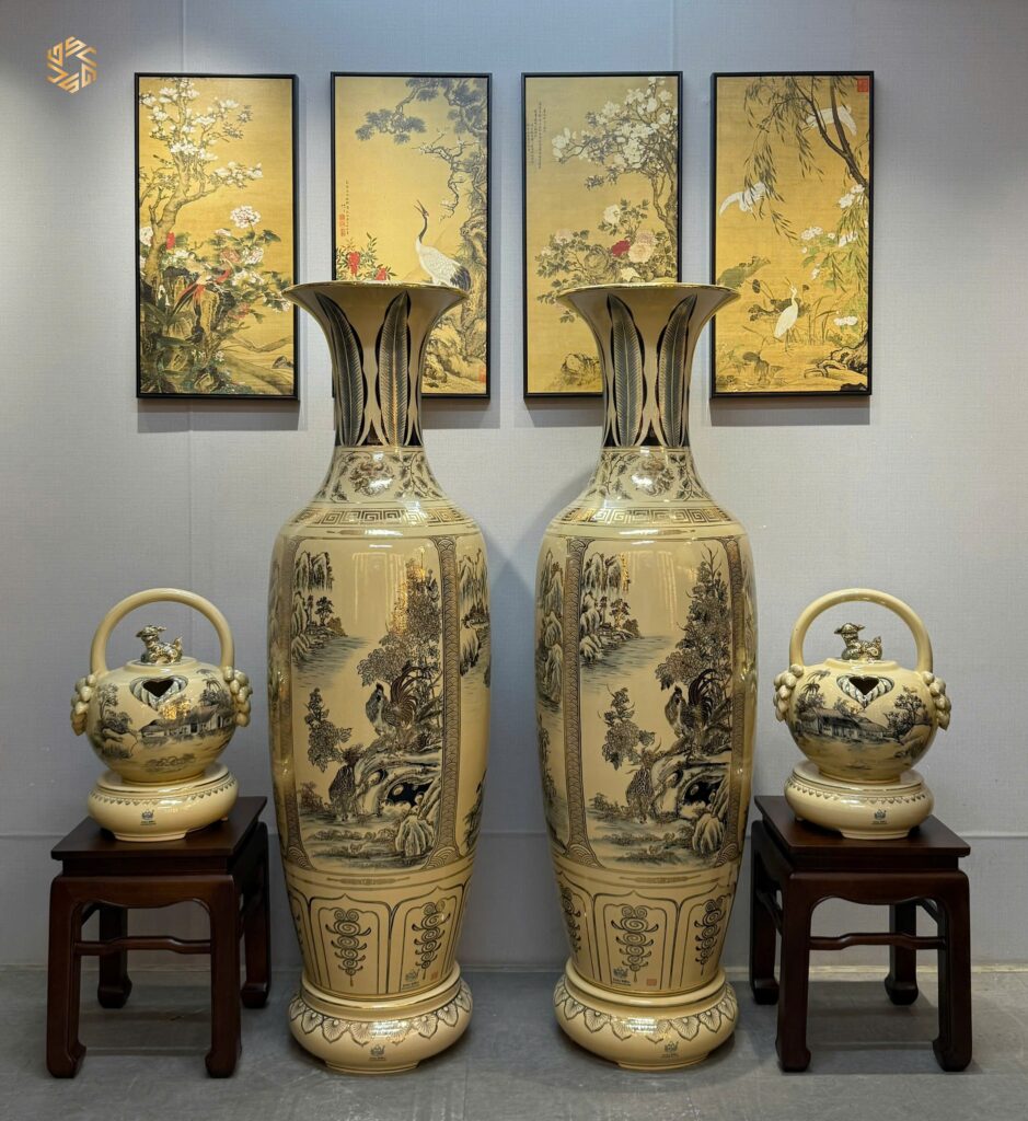 Combo Gốm Chu Đậu Lộc Bình 1M65 Tứ Cảnh Sơn Thuỷ & Bình Vôi Vẽ Vàng 24K Tinh Xảo