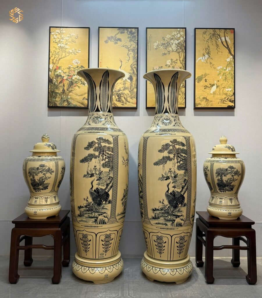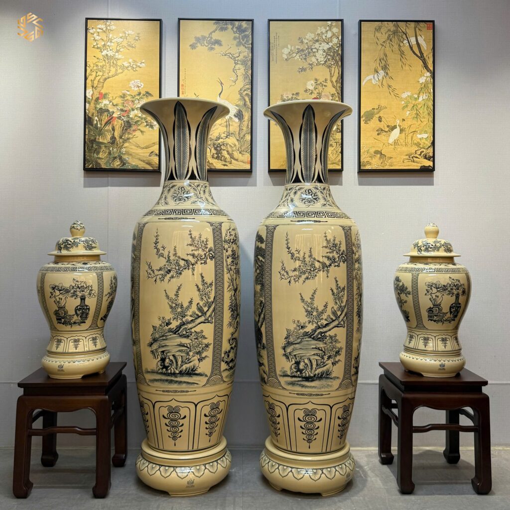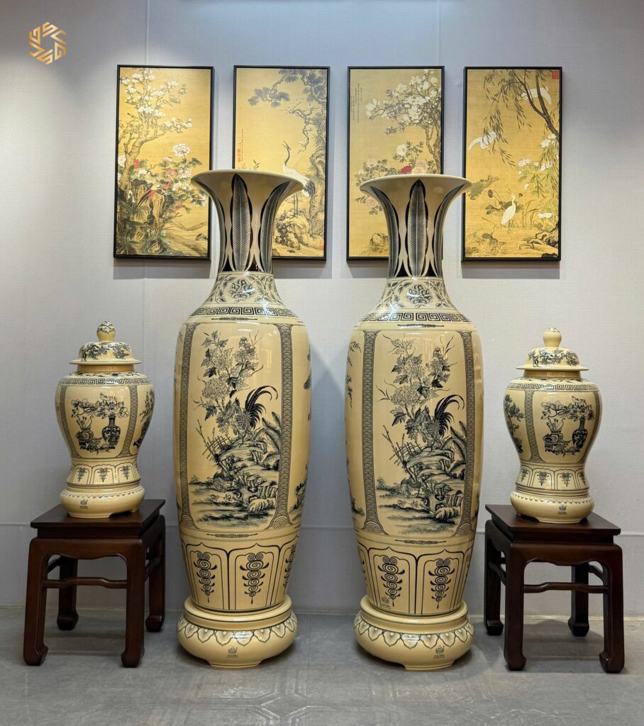 ComBo Lộc Bình Gốm Chu Đậu 1M65 Hoạ Tiết Tứ Cảnh Bốn Mùa & Cặp Choé Cổ Đồ Men Gốm Truyền Thống