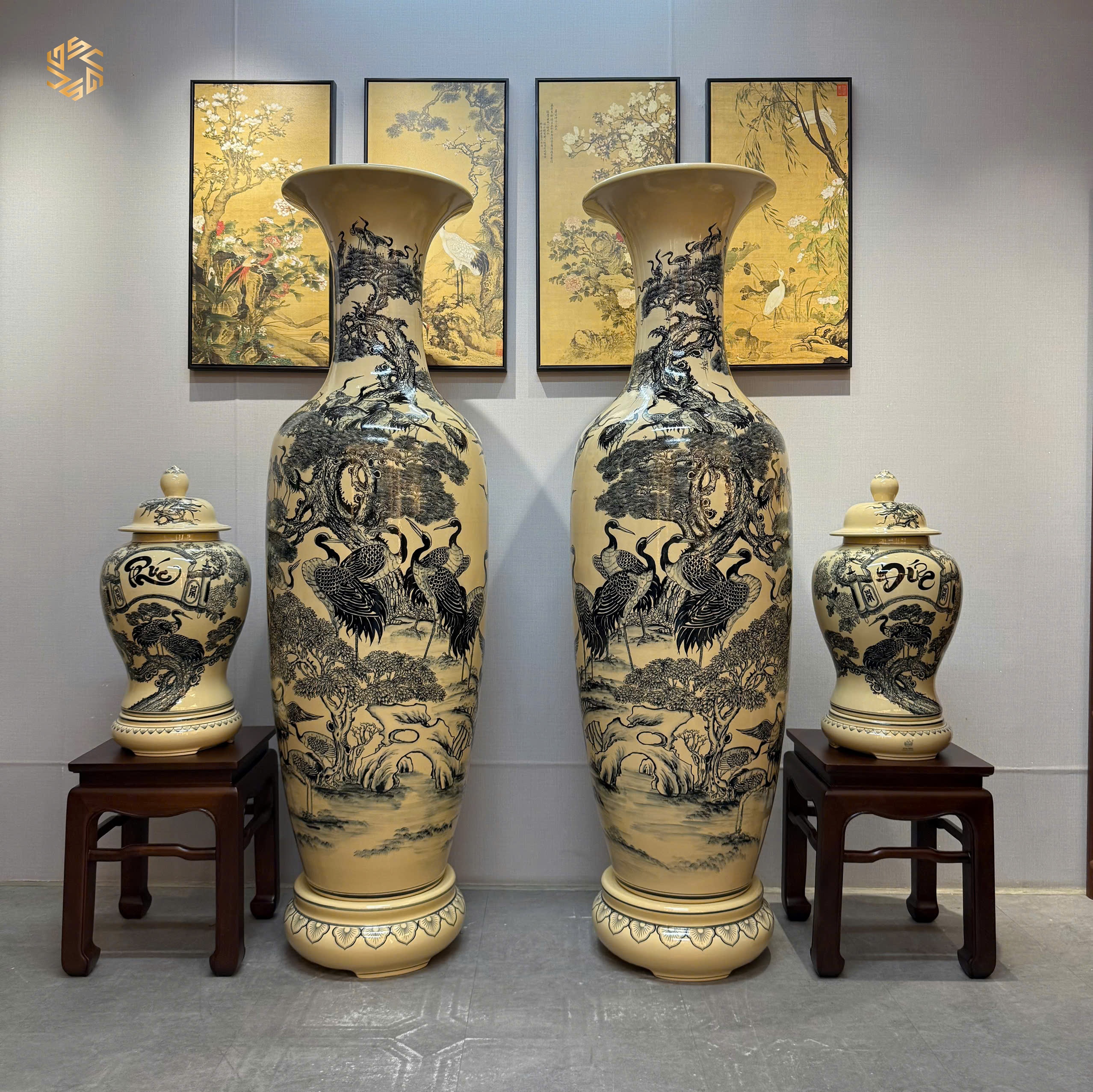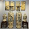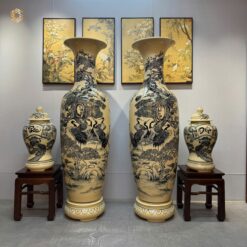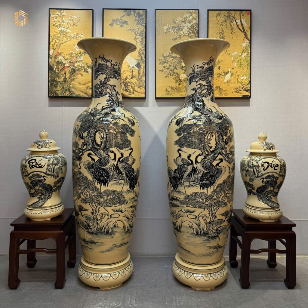 ComBo Lộc Bình Gốm Chu Đậu 1M75 Hoạ Tiết Bách Hạc Quần Tùng & Cặp Choé Phúc Đức H60 Men Gốm Truyền Thống