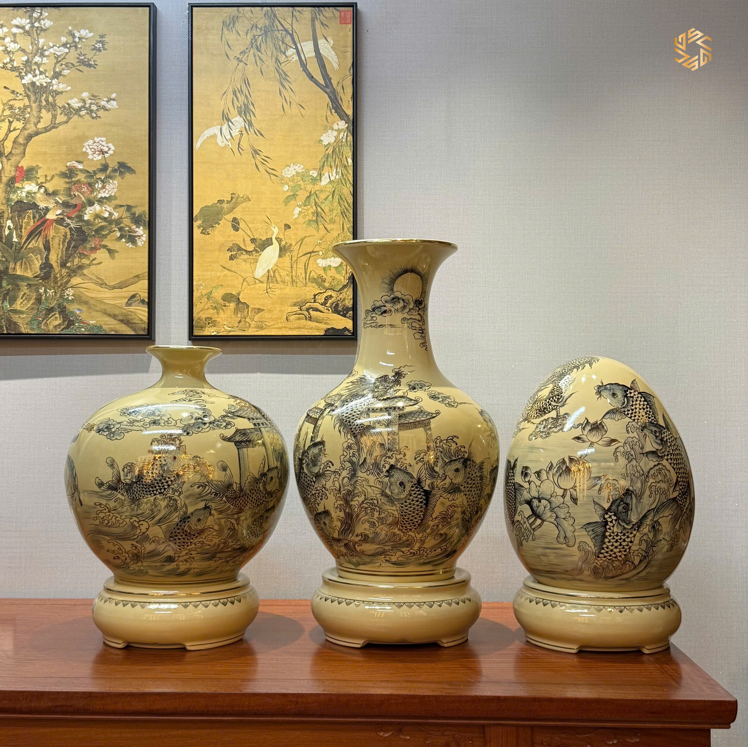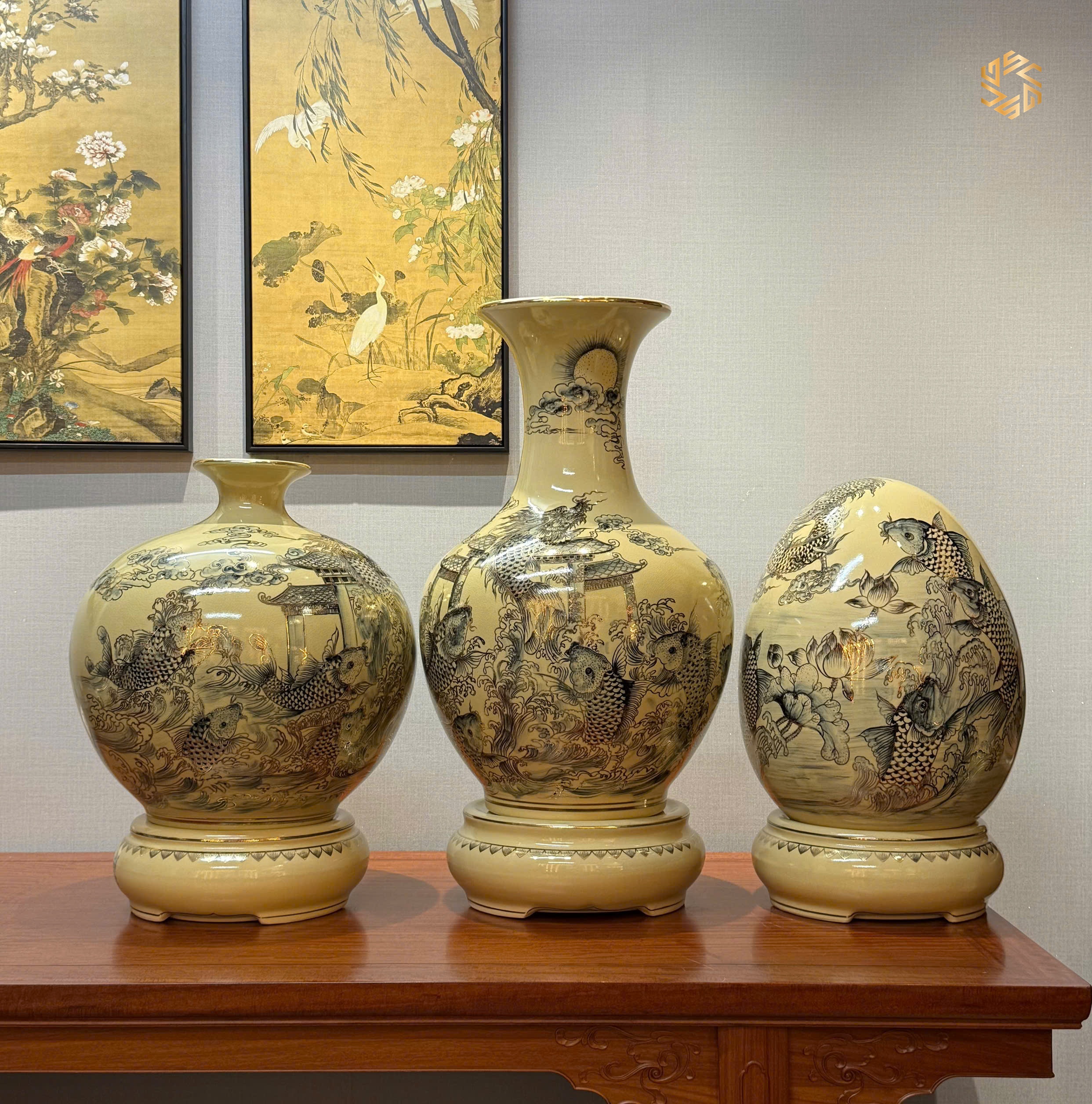 Combo Trứng Tài Lộc H45 & Bình Hút Lộc H45 & Bình Phú Quý H65 Cá Chép Vượt Vũ Môn Vẽ Vàng 24K