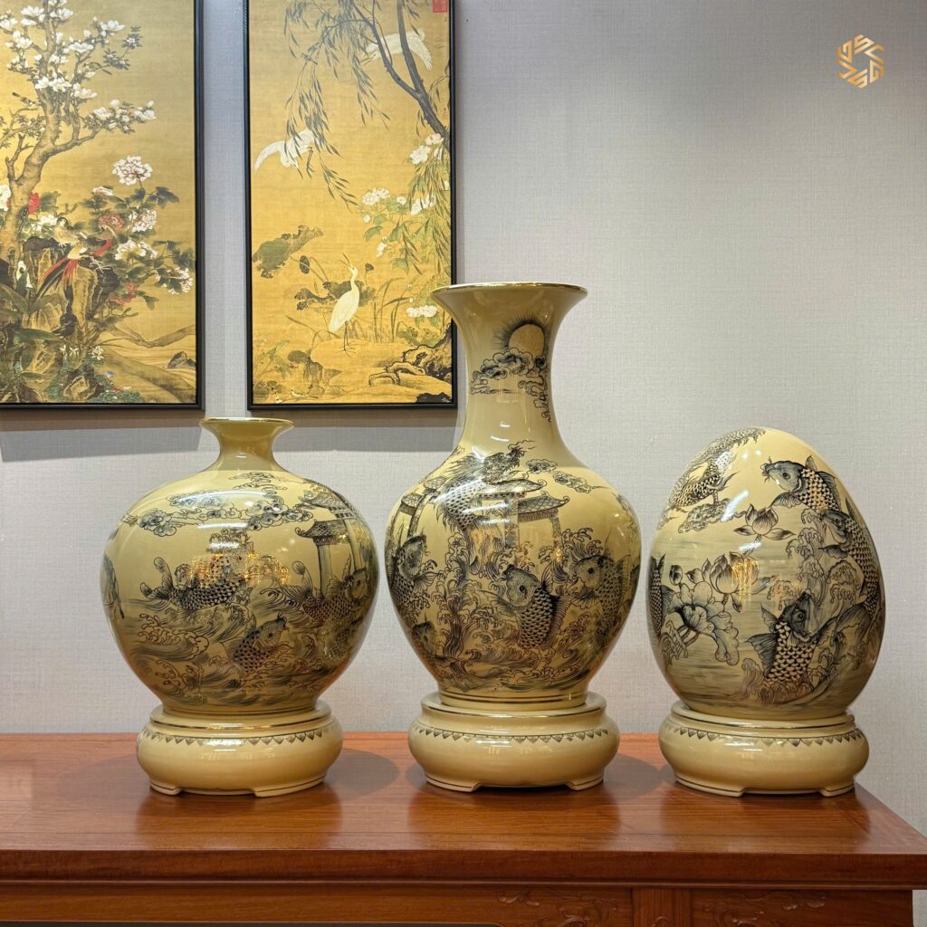 Combo Trứng Tài Lộc H45 & Bình Hút Lộc H45 & Bình Phú Quý H65 Cá Chép Vượt Vũ Môn Vẽ Vàng 24K