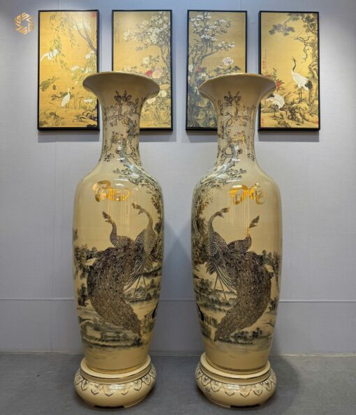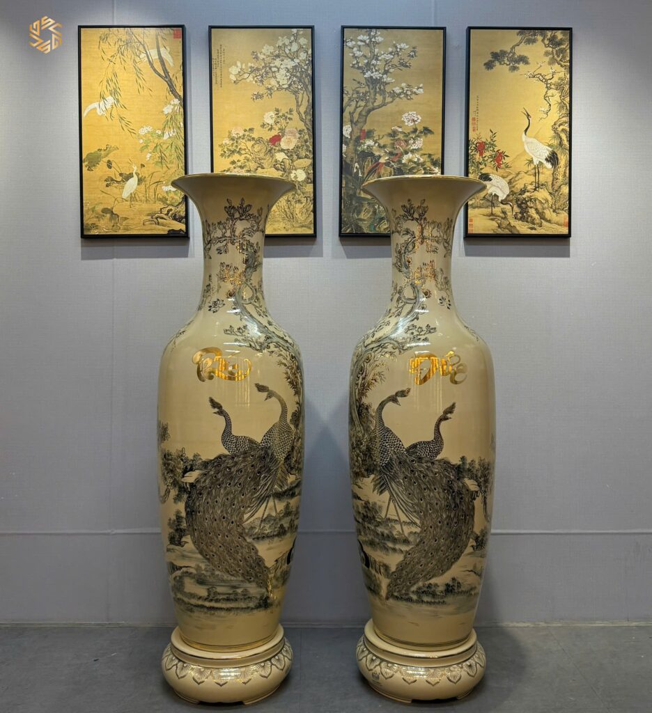 Lộc Bình H190 gốm chu đậu hoạ tiết Chim Công Hoa Đào vẽ vàng 24k LBCĐ05