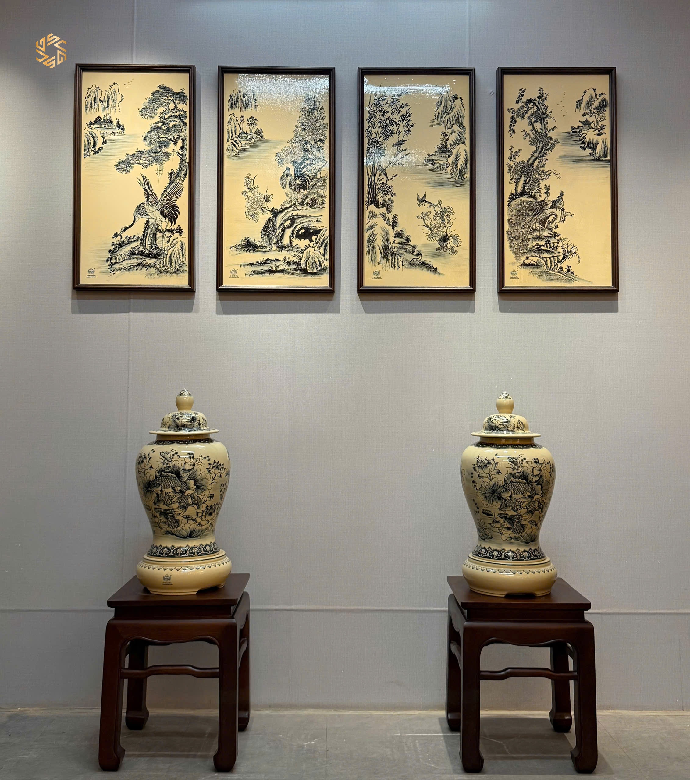 - Tranh gốm Chu Đậu Tứ Cảnh (Xuân – Hạ – Thu – Đông) với men gốm truyền thống mang vẻ đẹp văn hóa, chiều sâu nghệ thuật và giá trị thẩm mỹ bền vững. Dòng tranh này đặc biệt phù hợp với những không gian trang trí đề cao sự tinh tế, sang trọng và bản sắc Việt